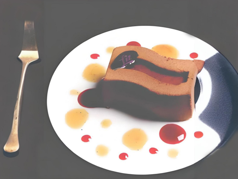 焦糖咖啡蛋糕的波浪彎曲造型具有躍動感,因此可在盤中加入大小不一的紅黃色點,充滿活潑與趣味,彷彿一幅波普現代畫。