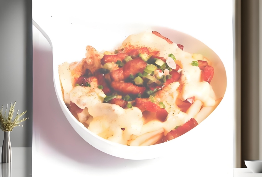 作法:將薯條放入高溫油鍋中炸熟撈起,培根切片後煎熟,起司醬加入鮮奶混合成泥狀。