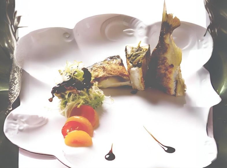 這道擺盤使用了造型特殊的大型花瓣狀圓盤,由於主菜與盤面尺寸懸殊,如何均衡布局成為設計的最大挑戰。為了填補盤面空間並創造層次感,將香魚切成三段,露出斷面可見魚腹內的酸菜餡料,勾起食欲。尾部往上伸展,頭部橫向擺放,延展出視覺空間。此外,為了延續視覺動線,主廚加入少許配菜點綴盤面,但避免太多元素造成雜亂,保持乾淨、簡約的風格。