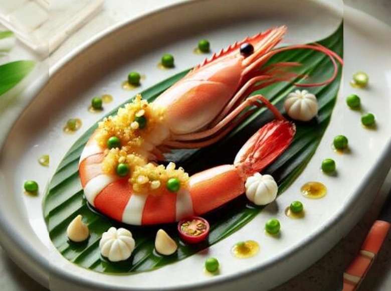 因為澎湖明蝦本身體型不小,將蝦對切剖半後,採用對角擺放,搭配翠綠的竹葉來襯托橙黃的明蝦,色彩鮮明大方。