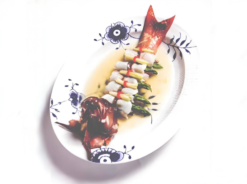 中菜魚料理並搭配精緻的花草圖案的盤面,呈現出古典的感覺。為避免使用全魚視覺上顯得過於豐滿,魚肉捲的處理方式既精緻又避免厚重,並以蔥白來襯托魚肉的白嫩,紅辣椒則點出紅魚的色澤。